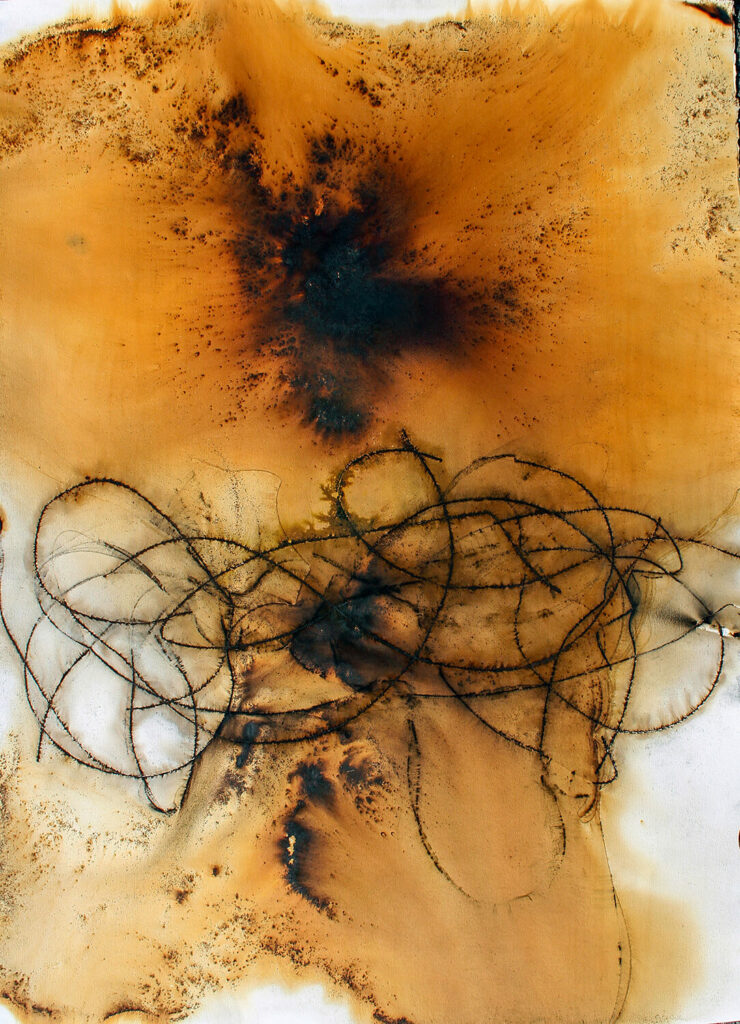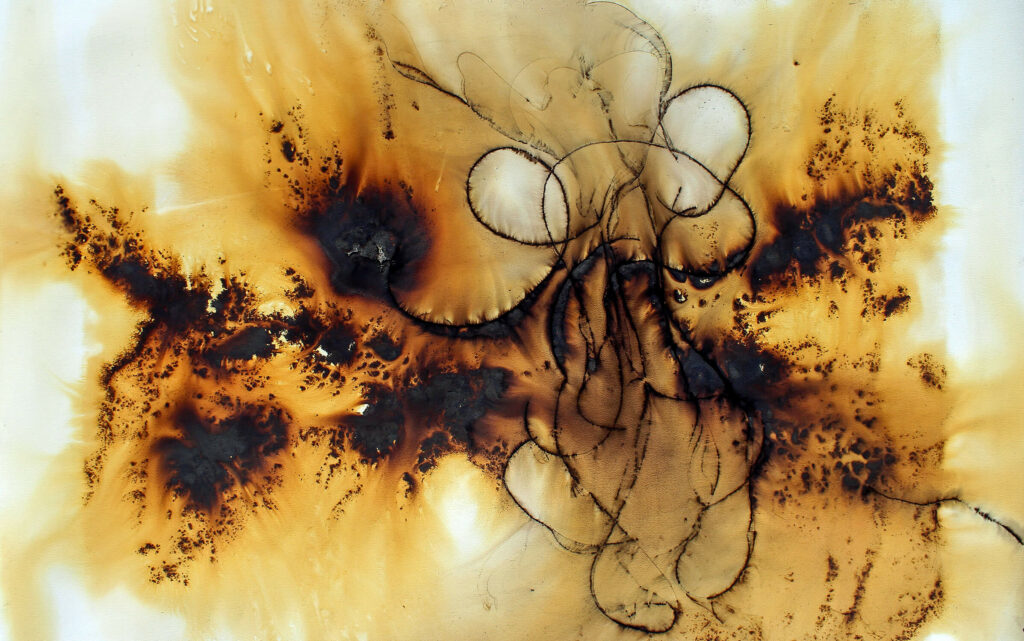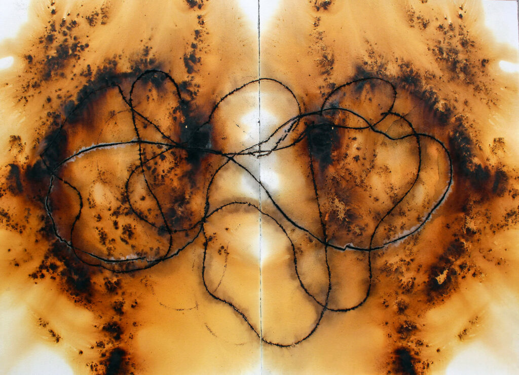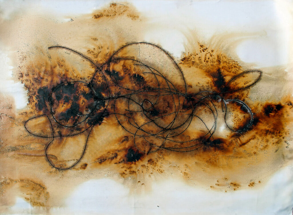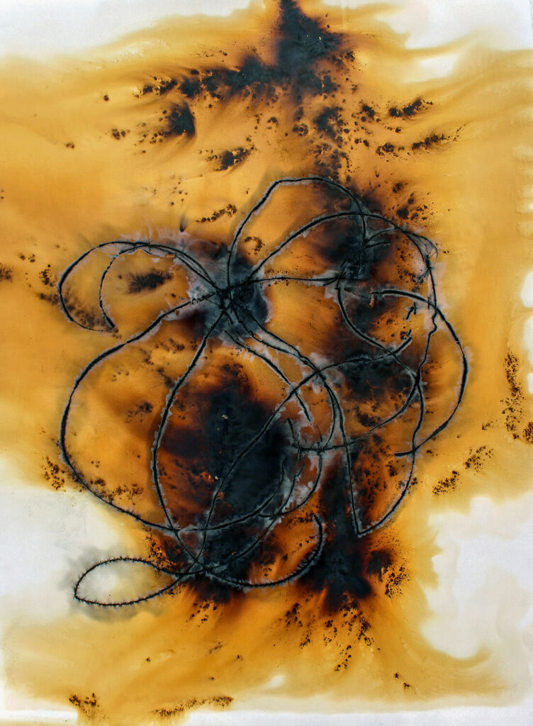 The core of calligraphy is actually in the doing, or as a verb. It is the gesture that is more important than simply beautiful writing of letters or characters. Having said that though, the basis of calligraphy is text, and the basis of text is the line. These works use the QWERTY line that I developed as information transfer, whilst incorporating the Ancient material of gunpowder fused with contemporary substrates. Here the ancient and new conflate Eastern and Westsrn concerns to make artwork that satisfies Calligraphy’s long and complex history of reabsorbing the new, whilst honouring ancient Traditions.