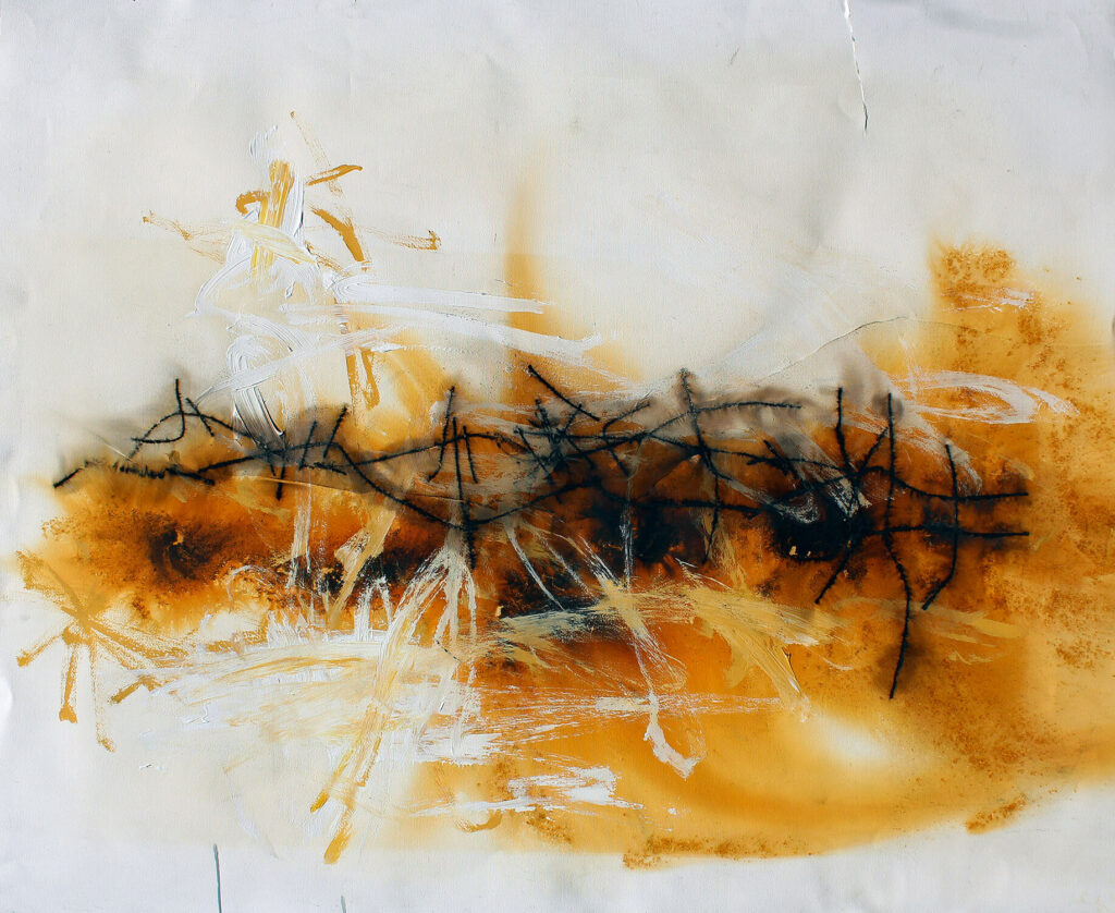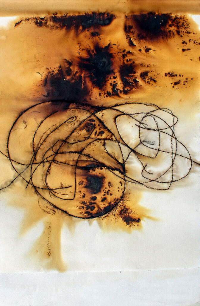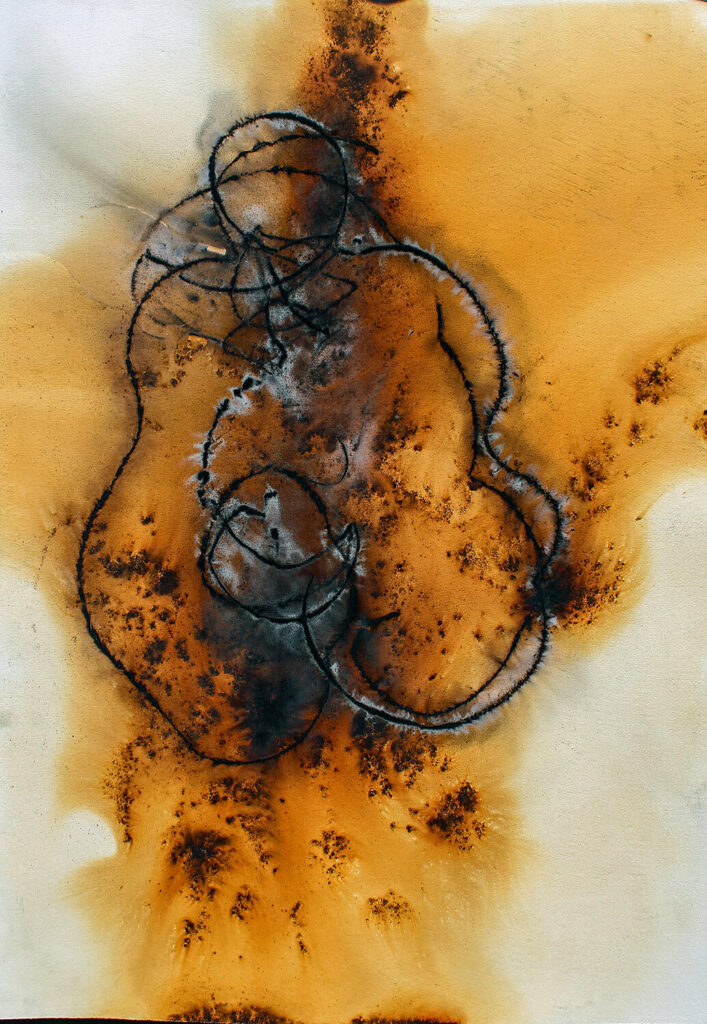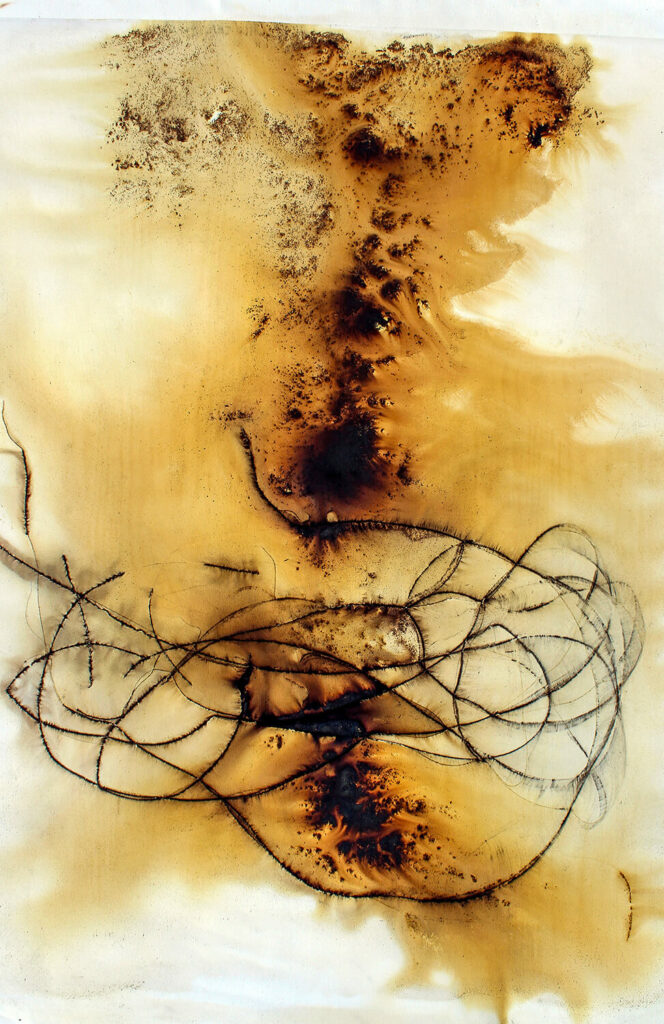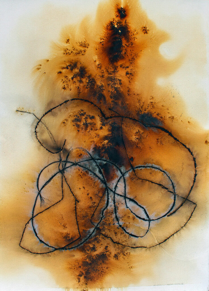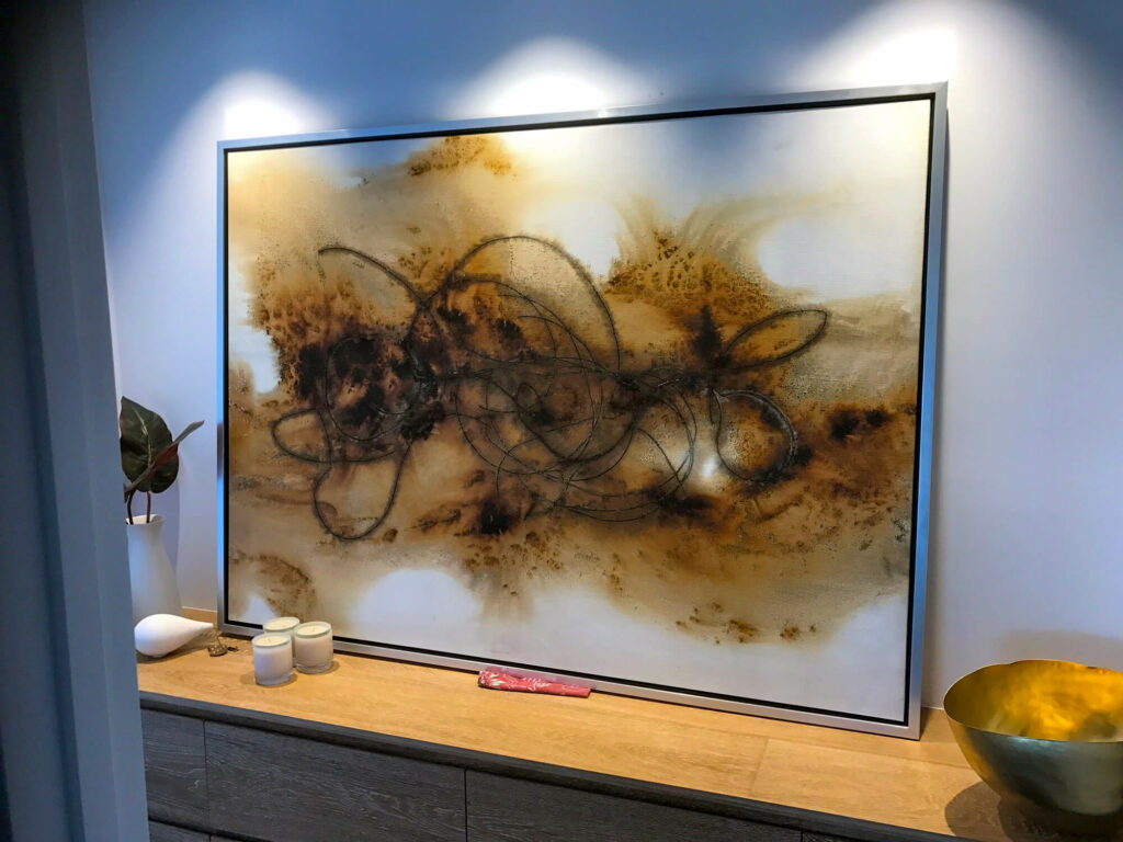 The core of calligraphy is actually in the doing, or as a verb. It is the gesture that is more important than simply beautiful writing of letters or characters. Having said that though, the basis of calligraphy is text, and the basis of text is the line. These works use the QWERTY line that I developed as information transfer, whilst incorporating the Ancient material of gunpowder fused with contemporary substrates. Here the ancient and new conflate Eastern and Westsrn concerns to make artwork that satisfies Calligraphy’s long and complex history of reabsorbing the new, whilst honouring ancient Traditions.